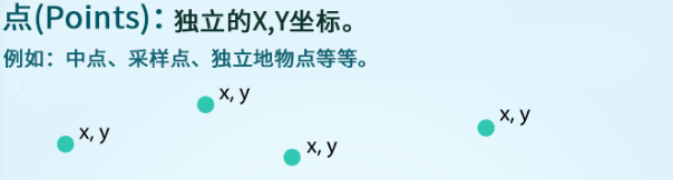 点数据可直接用坐标值描述,每个点是由单独的X,Y坐标定义的,在一个点矢量文件中可以包含多个点。点数据可以包含:采样点、独立树、测量点等等。