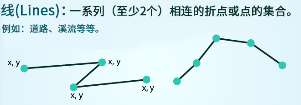 线数据可用均匀或不均匀间隔的顺序坐标链来描述,线是一系列(至少2个)相连的折点或点的集合。道路、溪流都可以以线的形式表现。线包含一系列的线段或弧,每段线都是由折点的X,Y坐标所定义的。