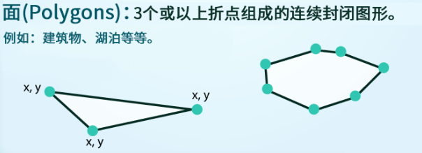 面状数据(或多边形数据)可用边界线来描述,面是由3个或以上的折点组成的连续封闭图形。建筑物、湖泊、海洋、国家等等都可以以面来表示。
